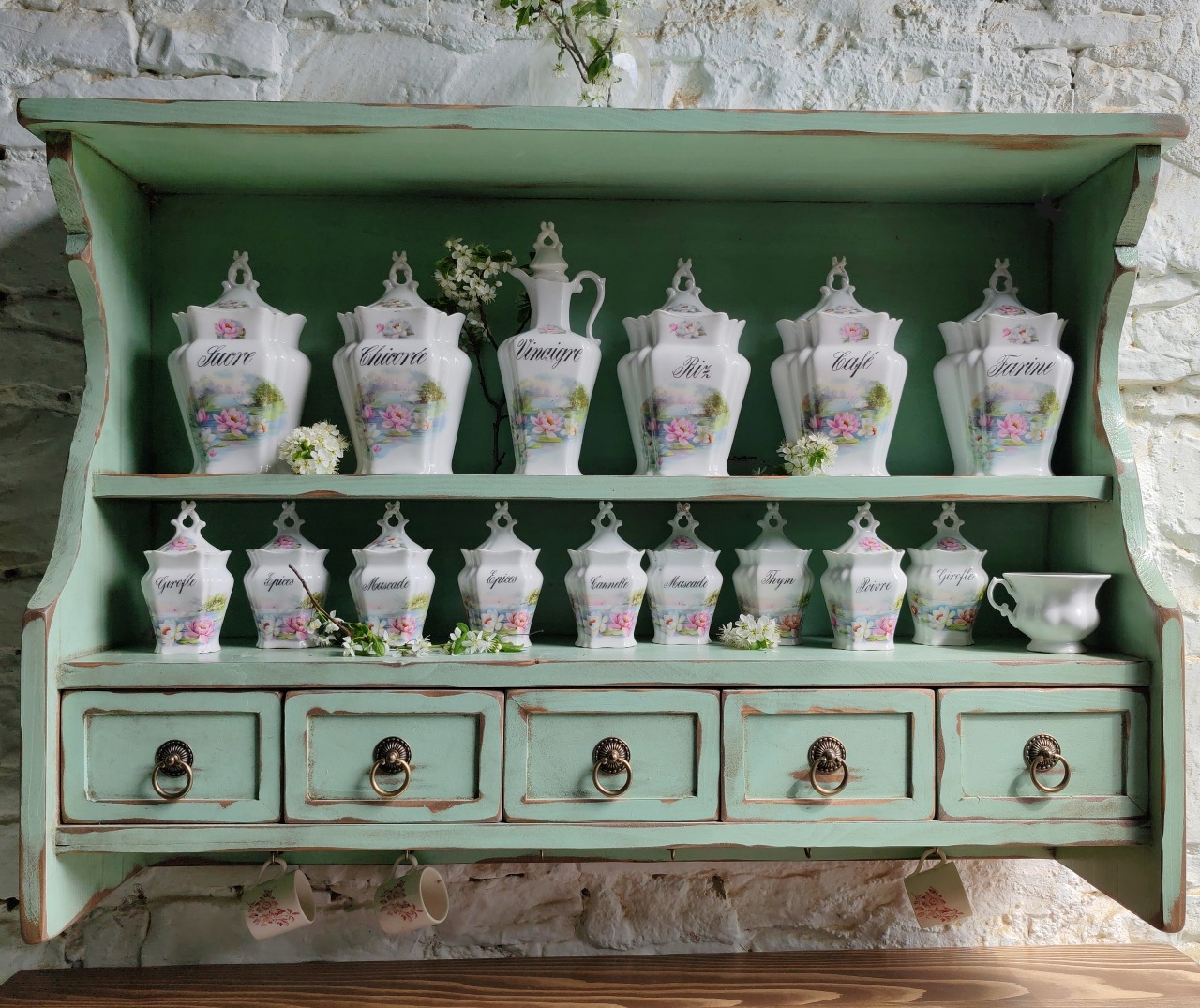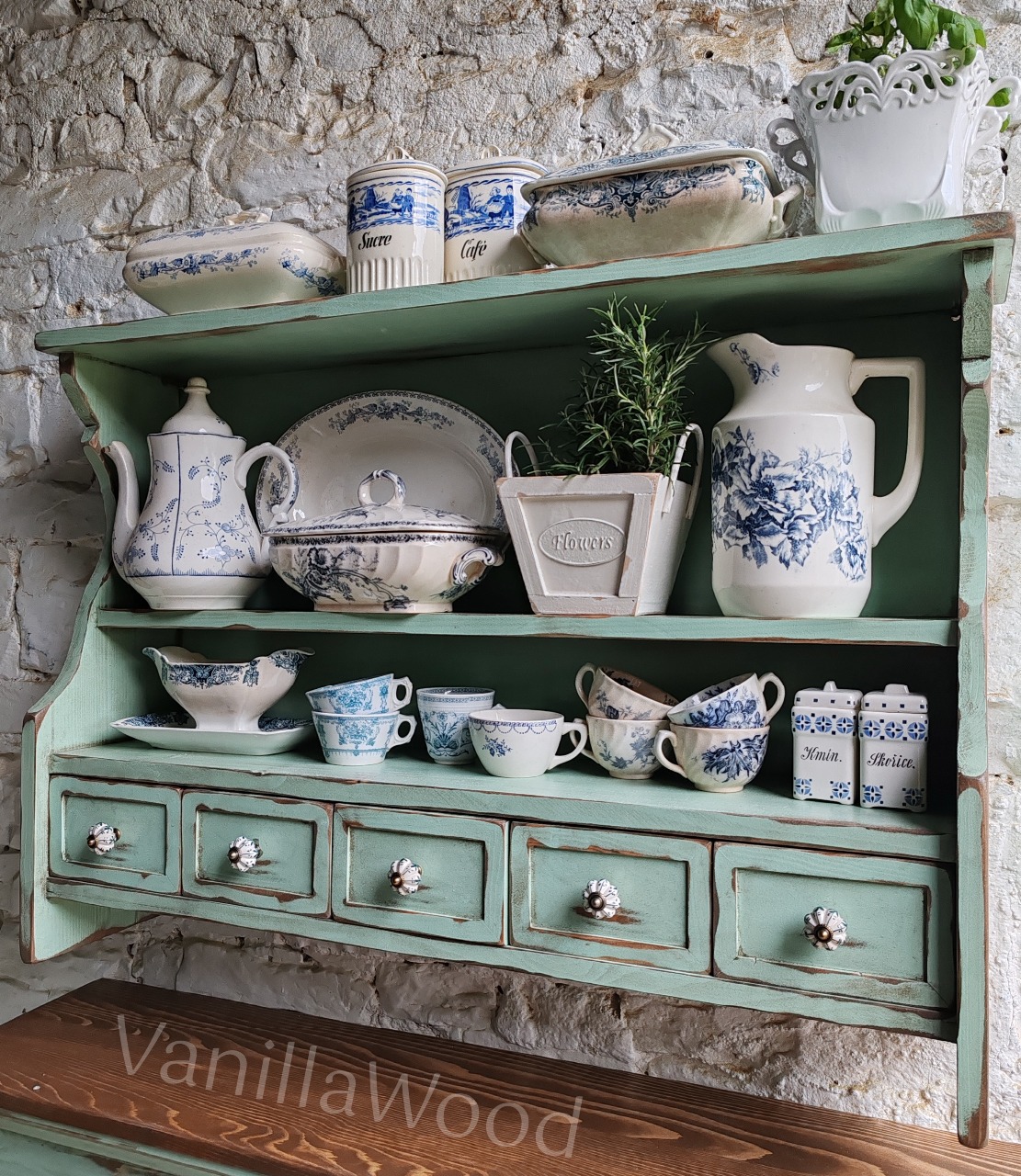 Police s šuplíčky z borového masivu.
